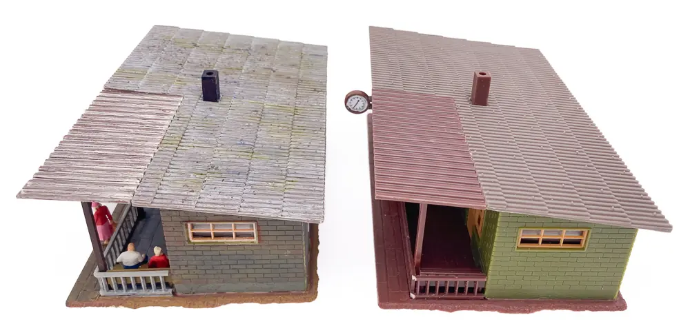 Da wirkt der nagelneue, zusammen geklebte Bausatz aus dem Karton wenig natürlich, denn oft enthalten die typischen Szenen auf Modelleisenbahnen Objekte, die eine natürliche Patina enthalten sollten. Auch im Realen hat ja der Zahn der Zeit daran genagt. Das kann aber jeder selbst ganz einfach an jedem Modellbausatz nachholen und diese Gebäude patinieren, damit die dargestellten Szenen und Situationen realistischer aussehen und eine natürlichere Atmosphäre ausstrahlen.