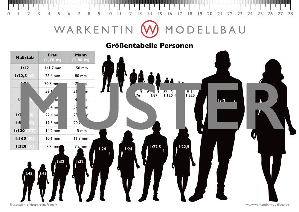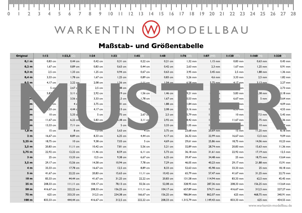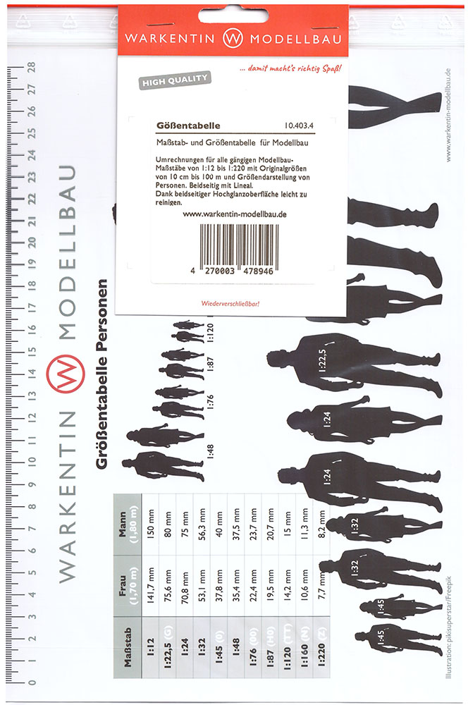 Mit der Maßstab- und Größentabelle für Modellbau sind Umrechnungen für alle gängigen Modellbau-Maßstäbe kein Problem mehr. Die Tabelle enthält Umrechnungen für Maßstäbe von 1:12 bis 1:220 mit Originalgrößen von 10 cm bis 100 m. Um eine realistische Vorstellung der Größe von Personen zu bekommen, enthält die Tabelle auf der Rückseite die Größendarstellung von Personen. Männliche Personen mit einer Größe von 1,80 m und Frauen mit einer größe von 1,70 m werden ebenfalls in den Maßstäben von 1:12 bis 1:220 dargestellt. Das praktische Hilfsmittel für den Modellbau enthält beidseitig ein Lineal.