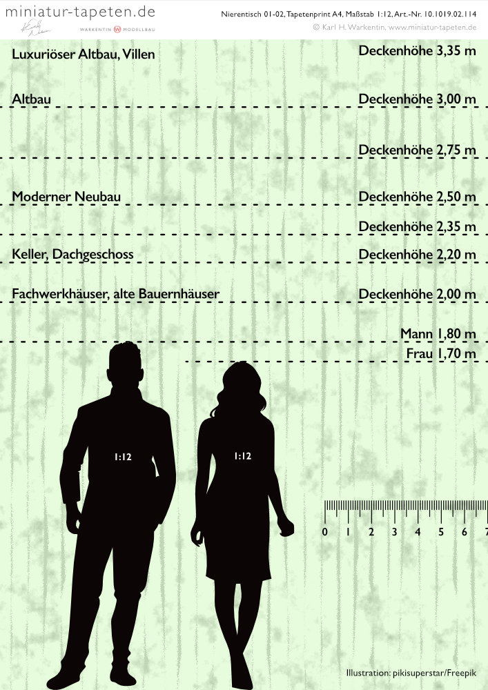 Die Miniatur-Tapeten von miniatur-tapeten.de werden auf hochwertiger, selbstklebender, wasser- und abriebfester Vinyl-Folie mit matter Oberfläche im Format DIN A4 für die Maßstäbe 1 : 12, 1 : 24 bzw. 1: 48 im Format DIN A4 mit professionellen Epson-Großformat-Druckern und K3-Pigment-Ink gedruckt. Auf Anfrage können auch andere Maßstäbe oder Miniatur-Tapeten im Format DIN A3 oder größer geliefert werden.